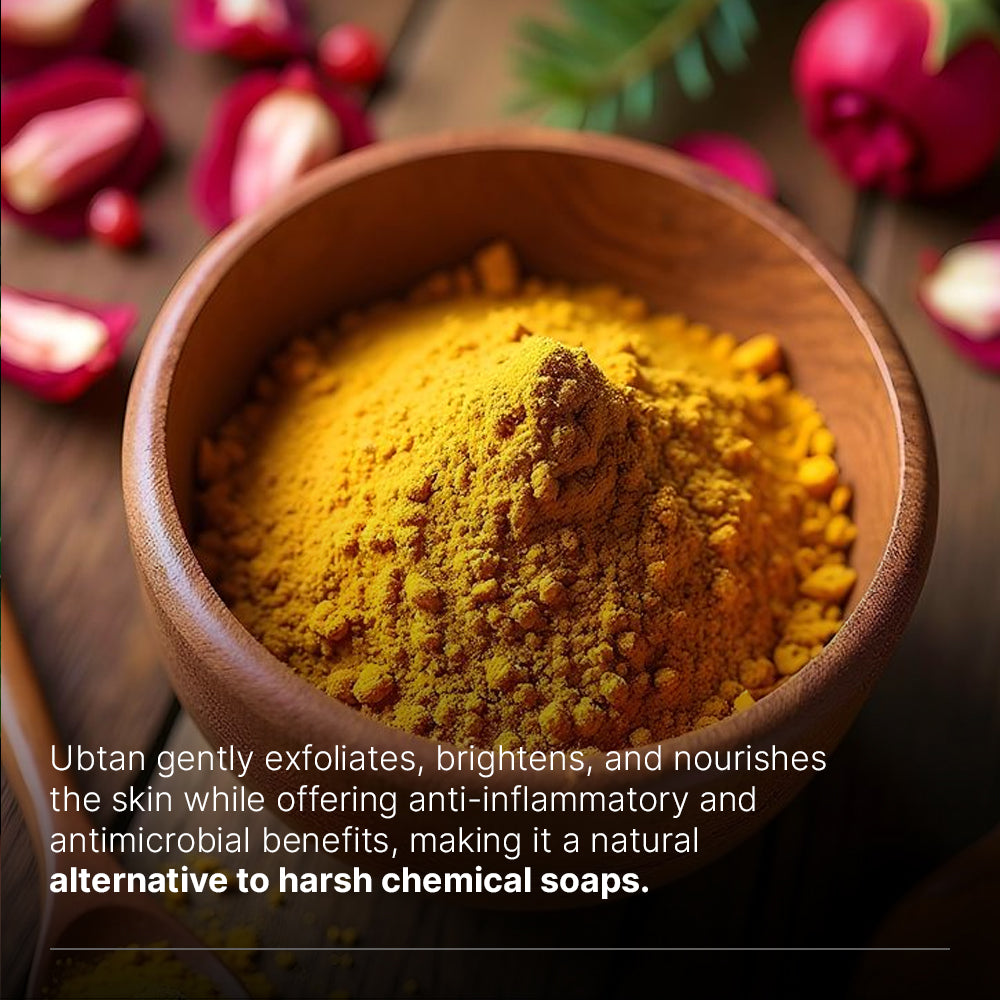 Ubtan is valued in Ayurveda for exfoliating, brightening, , anti-inflammatory, antimicrobial benefits and nourishing skin surpassing chemical soap’s harsh and synthetic formulations.